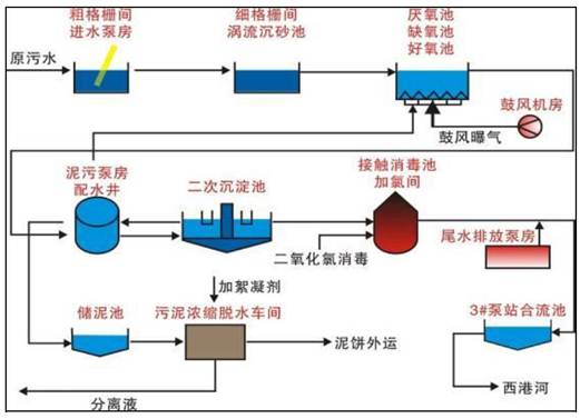 主要生產(chǎn)設(shè)備:粗格柵、進(jìn)水泵房、細(xì)格柵、沉砂池、生化池、鼓風(fēng)機(jī)、脫水機(jī)房、二氧化氯消毒池、尾水泵站、廠(chǎng)外泵站