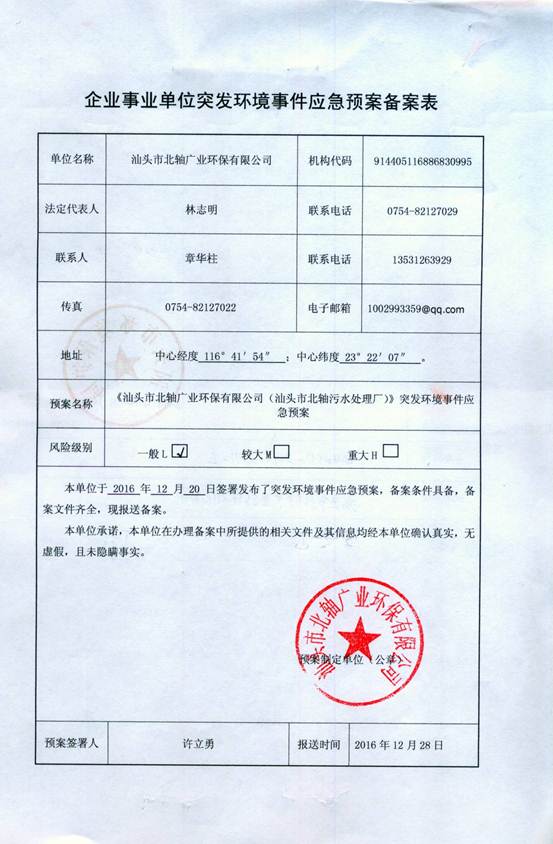 汕頭市北軸廣業(yè)環(huán)保有限公司根據(jù)自身實(shí)際情況制定了突發(fā)環(huán)境事件應(yīng)急預(yù)案,并成立了環(huán)境污染突發(fā)事件應(yīng)急處理領(lǐng)導(dǎo)小組,根據(jù)制定的應(yīng)急預(yù)案定期開(kāi)展應(yīng)急演習(xí),以確保做到對(duì)突發(fā)環(huán)境事件反應(yīng)快速,救援及時(shí),應(yīng)對(duì)措施得力有效,保障社會(huì)穩(wěn)定、人民生命財(cái)產(chǎn)和生態(tài)環(huán)境安全,保證企業(yè)安全生產(chǎn)和經(jīng)濟(jì)效益的提高。