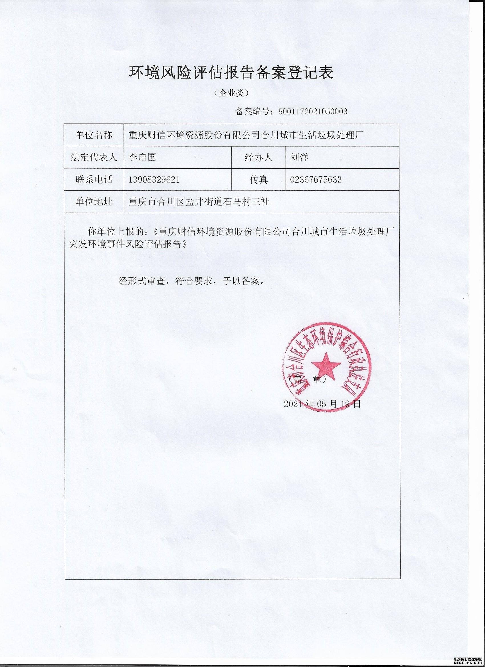 已制訂《重慶財信環(huán)境資源股份有限公司合川城市生活垃圾處理廠環(huán)境風險評估》,并于2021年 5月20日在合川區(qū)環(huán)境保護局備案, 備案編號:5001172021050003 |